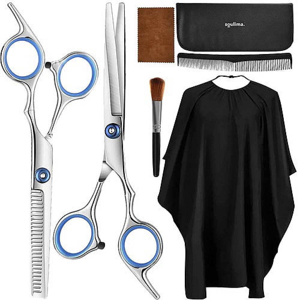 - BIG SET – the entire set contains 7 elements. It includes a hairdresser's cape that will protect your clothes from getting dirty during hairdressing treatments. 2 pairs of scissors. There is also a comb, a brush and a cloth for cleaning the scissors. The whole thing is very useful during haircuts and other hairdressing treatments.
