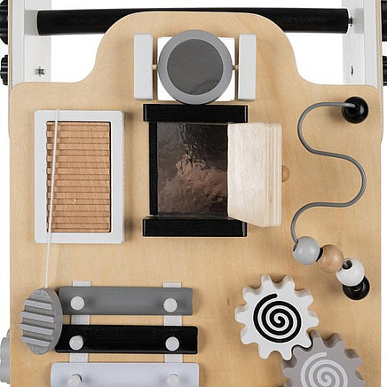 ?? доска манипуляций - толкатель оснащен многофункциональной доской для манипуляций, которая включает в себя: тарелки, счеты, лабиринт, движущиеся шарики, шестеренки, зеркало, открывающуюся дверь и головоломку с фигурами, Каждая стена предлагает разные занятия, которые обеспечивают долгие часы веселья и способствуют развитию способностей ребенка.
