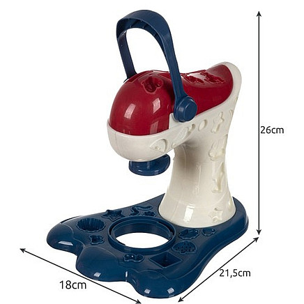 - МИКСЕР + ШПРИЦ - В комплект входит машинка в виде миксера, которая вращается под давлением переключателя и штампует печенье или кексы. Это не требует много сил, справится любой ребенок. В комплекте также есть шприц для выдавливания теста на тесто!