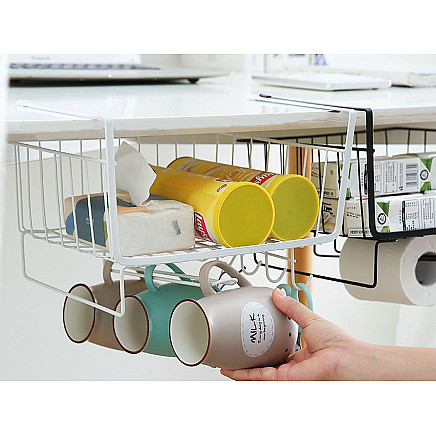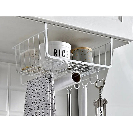 Благодаря специальным ручкам-крючкам органайзер устойчиво держится под полкой, не двигаясь и не шатаясь. Дополнительные крючки в нижней части позволяют подвешивать различные предметы, например, кухонные полотенца, кухонные принадлежности или ложки.