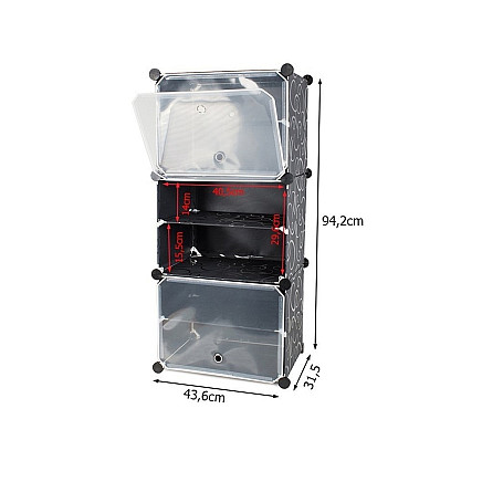 Он состоит из 3 сегментов, которые можно складывать друг на друга или ставить рядом в зависимости от потребностей и наличия свободного места. Он легкий и устойчивый Благодаря модульной конструкции его очень легко собрать Просто соедините металлические рамы с разъемами. ------ Шкаф оснащен прозрачными окнами , чтобы вы могли быстро найти то, что вам нужно достать, а также их можно установить так, чтобы они открывались вверх или вниз. Материал, из которого изготовлен шкаф, водонепроницаем и легко моется.