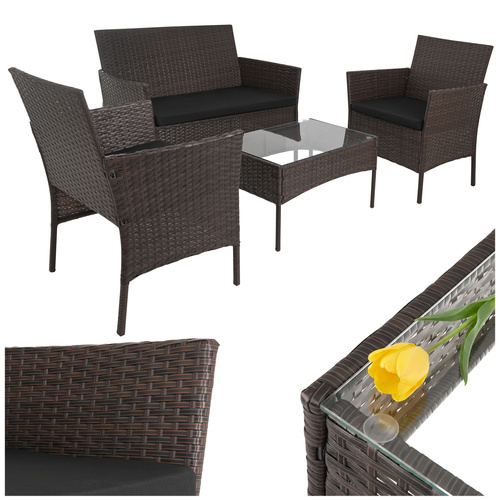 - материал: Каркас: оцинкованная сталь, покрытая технораттаном; подушки: полиэстер, наполнитель: хлопок; столешница: стекло.