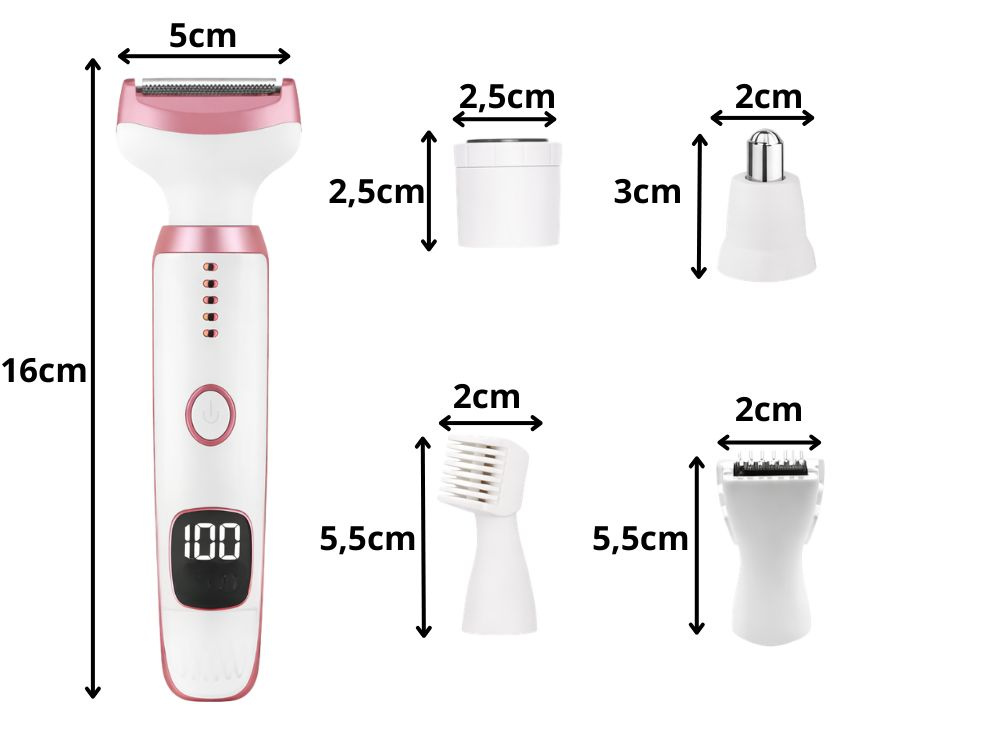 Практичное устройство 5в1 позволяет быстро и удобно удалять волосы с различных частей тела. В комплекте имеются сменные насадки, которые позволяют адаптировать устройство к индивидуальным потребностям.