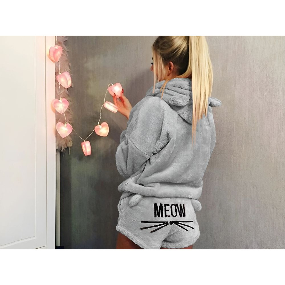 ТЕПЛАЯ ЖЕНСКАЯ ПИЖАМА ИЗ ДВУХ ЧАСТЕЙ С КАПЮШОНОМ МЯГКИЙ ПЛЮШ КОРОТКАЯ L