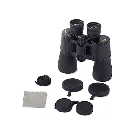 Благодаря нескользящему покрытию они идеально ложатся в руку, предотвращая удары и обеспечивая надежный захват Большие объективы диаметром 50 мм обеспечивают высокое качество изображения. Бинокль оснащен системой коррекции зрения в правом окуляре и регулировкой фокуса на перемычке между окулярными трубками.