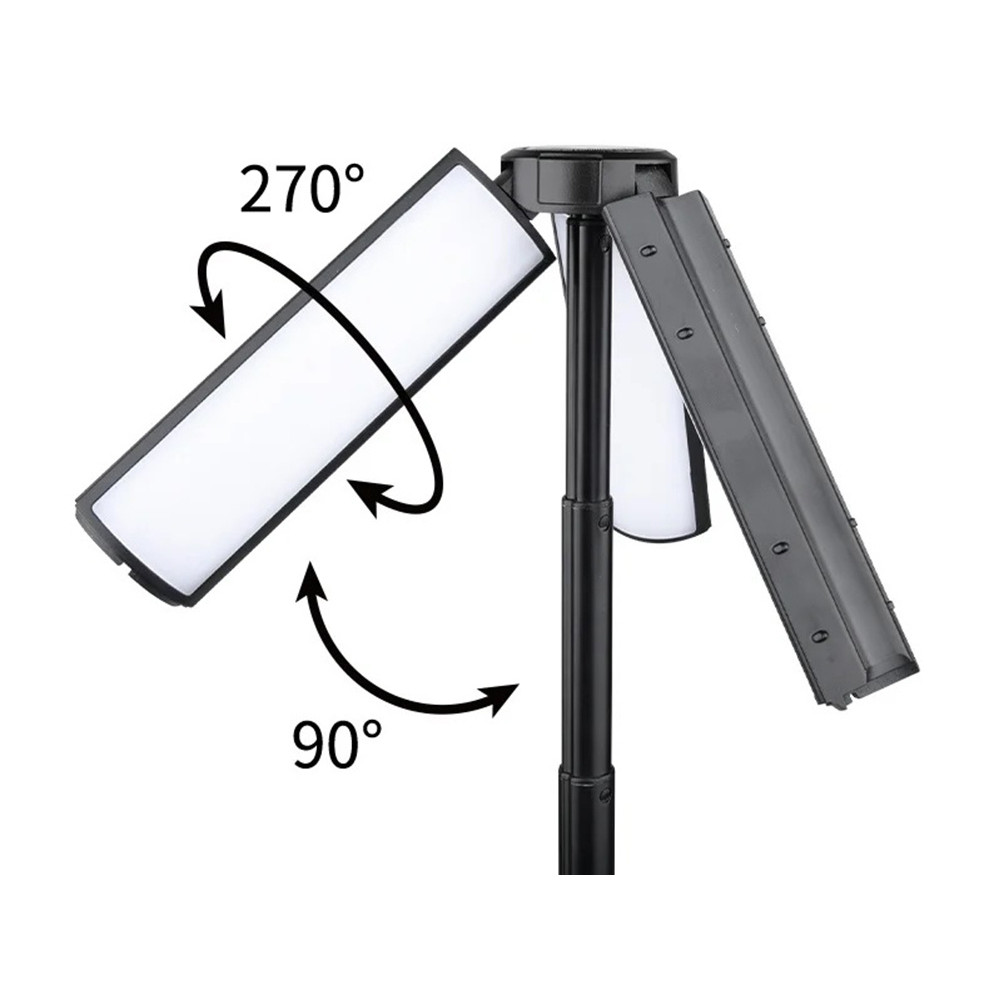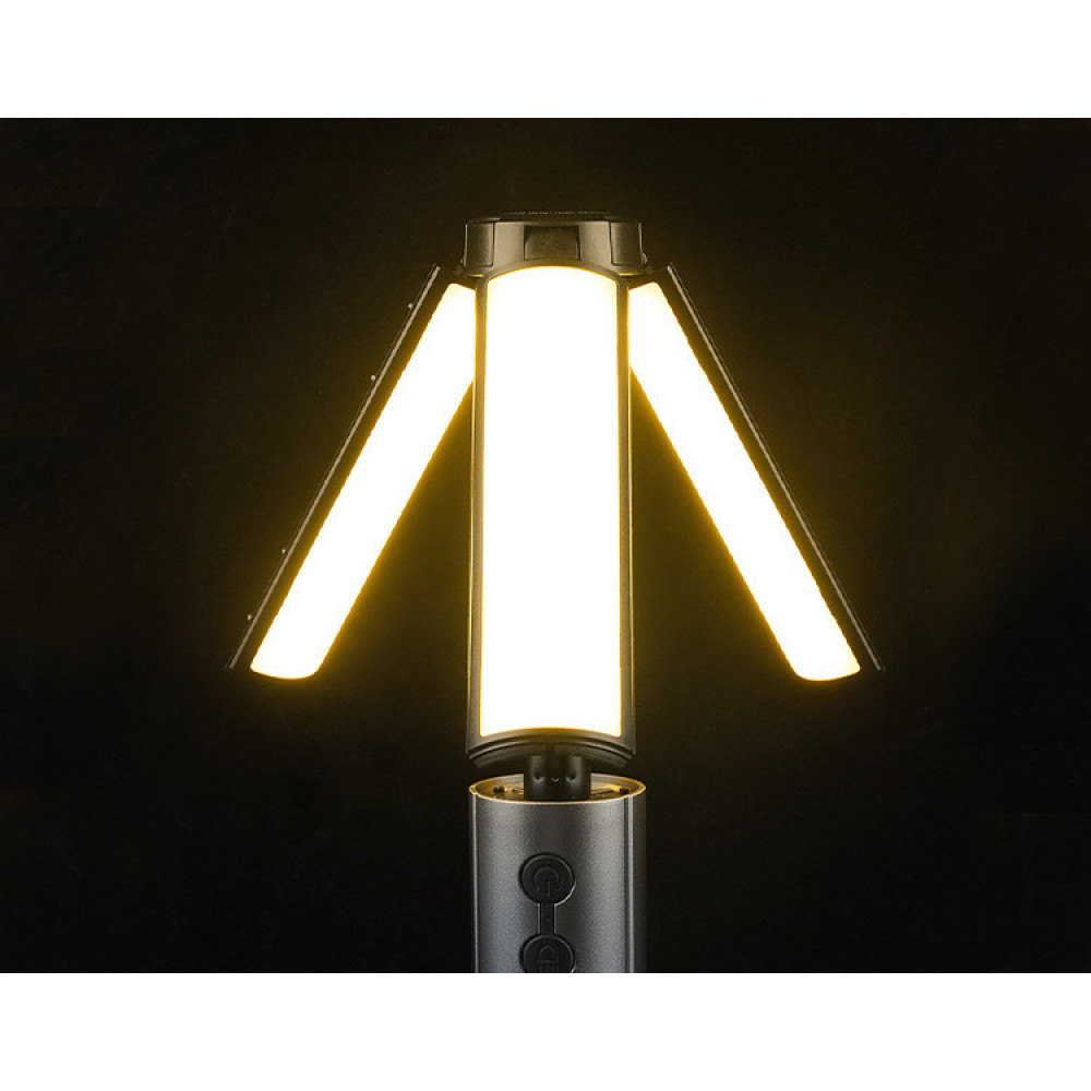 ИНТЕЛЛЕКТУАЛЬНОЕ ОСВЕЩЕНИЕ СО СВЕТОДИОДНЫМИ КРЫЛЬЯМИ И ФАКЕЛОМНа верхней части фонаря расположены три подвижных крыла с 54 теплыми светодиодами, которые освещают окружающее пространство под широким углом. Каждое крыло может быть независимо отрегулировано на 270° и наклонено на 90°, что позволяет идеально настроить направление света. В нижней части лампы дополнительно расположен мощный светодиод с функцией ZOOM, позволяющий сфокусировать свет на одной точке, что идеально подходит для использования в качестве ручного фонаря.