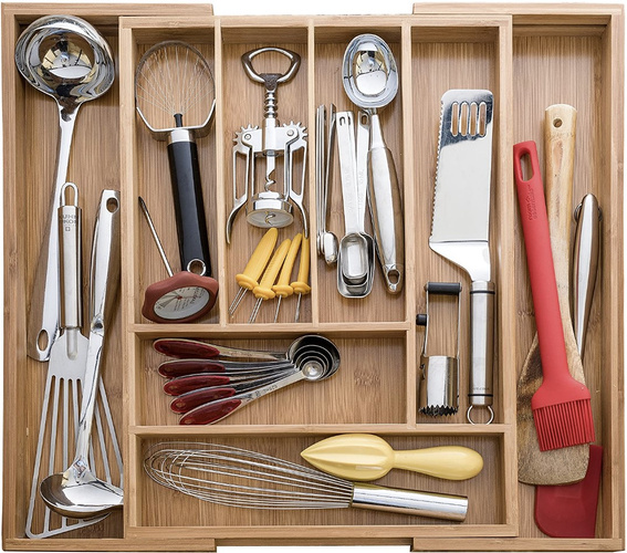- БАМБУК Этот органайзер для кухонных ящиков из бамбука отличается простым дизайном, который идеально впишется в современную кухню. Бамбук – подходящий материал для кухонных принадлежностей, поскольку он быстро сохнет, впитывает минимальное количество бактерий и выглядит элегантно. Поэтому такую вставку для ящика можно легко промыть под проточной водой, не опасаясь, что древесина впитает влагу и в ней разовьются грибки и бактерии.