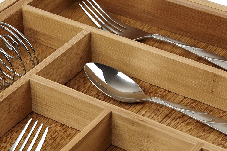 Столовые приборы — идеальное дополнение к сервировке стола. Стоит бережно за ними ухаживать и правильно хранить, чтобы они как можно дольше служили во время еды. Поэтому полезно обеспечить удобный и легкий доступ к ножам, вилкам, ложкам и чайным ложкам, хранящимся в ящике. Выберите изделие на свой вкус — выдвижную бамбуковую вставку для ящика, которая позволит хранить столовые приборы в гигиеничных условиях.